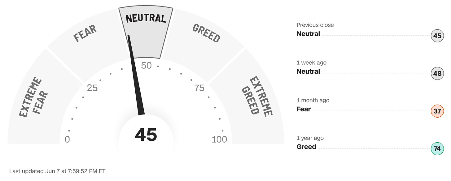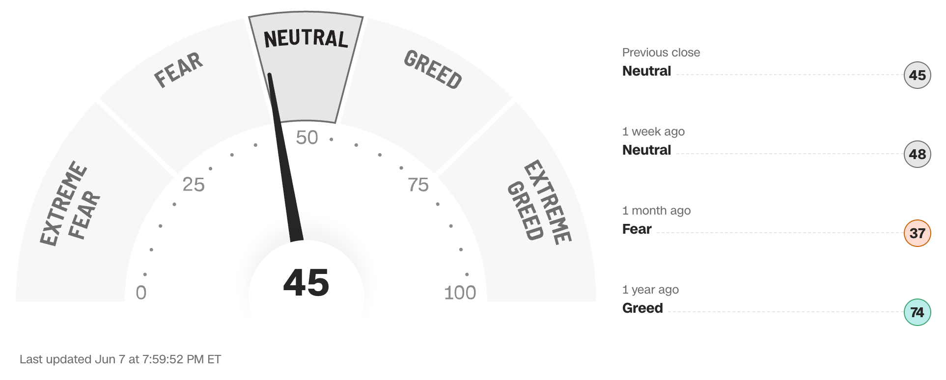 The Fear & Greed Index from CNN Business can be used as an attempt to gauge whether or not stocks are fairly priced and to determine the mood of the market. It is a compilation of seven of the most important indicators that measure different aspects of stock market behavior. They are: market momentum, stock price strength, stock price breadth, put and call option ratio, junk bond demand, market volatility and safe haven demand.