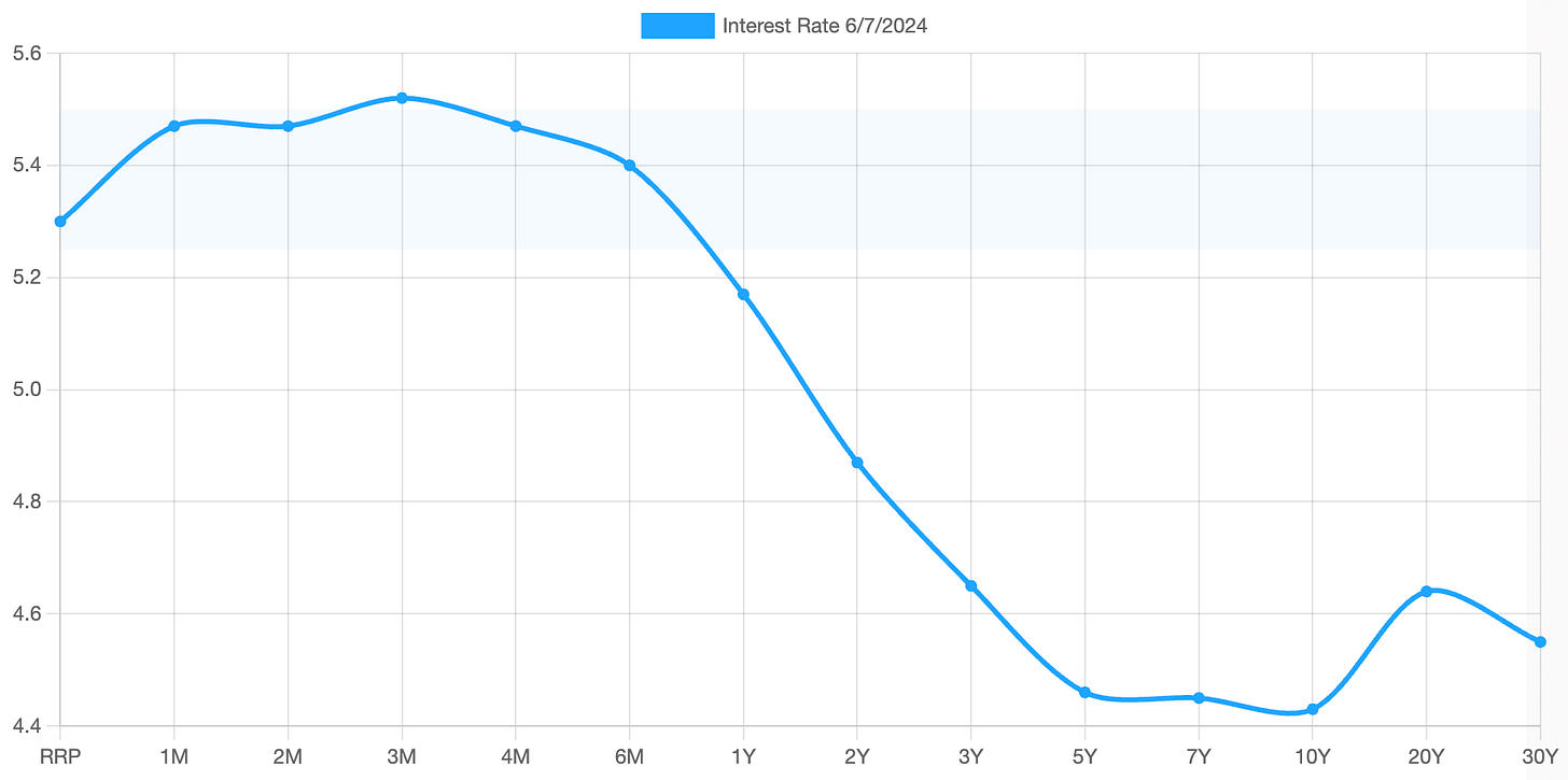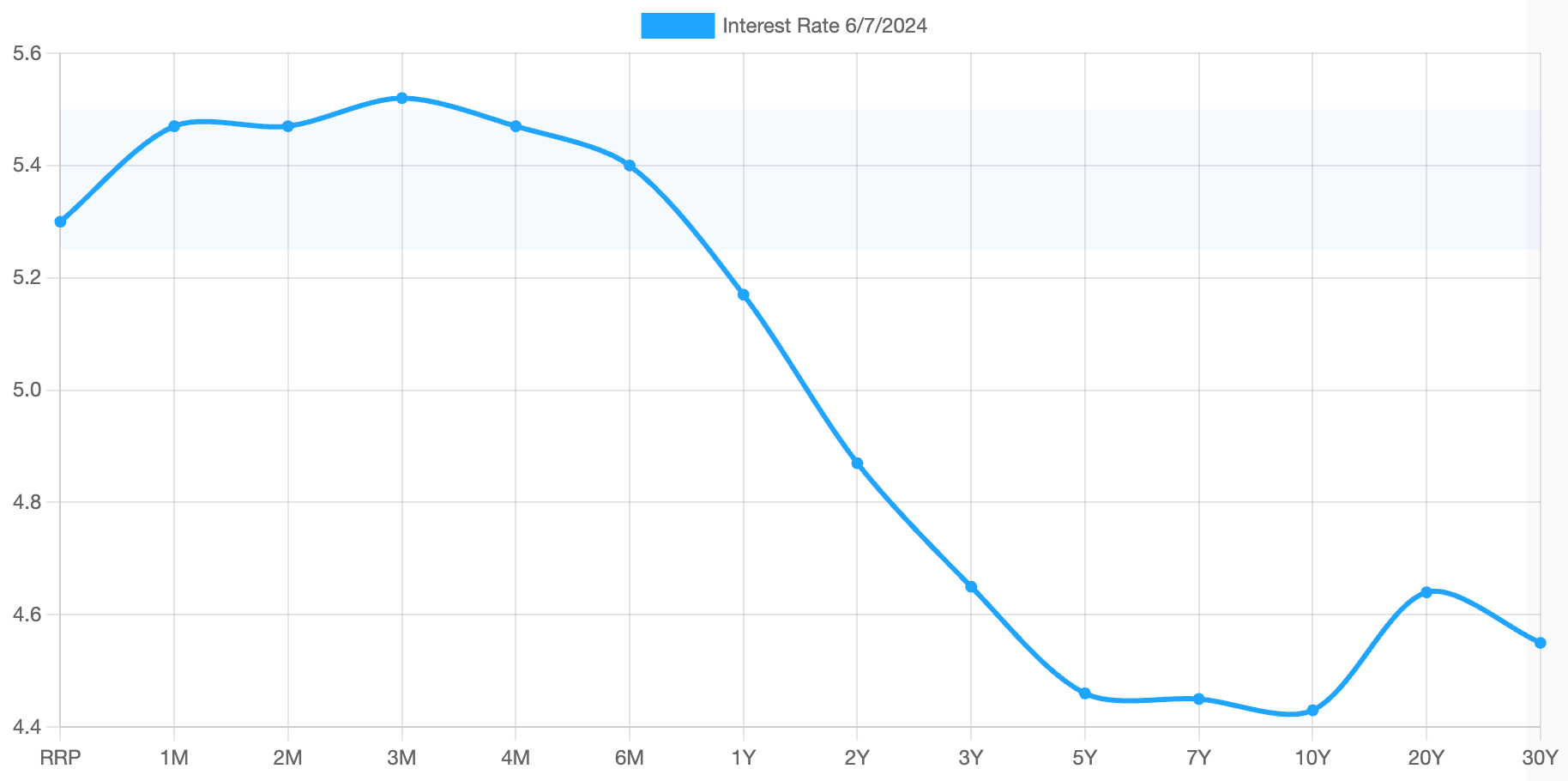 The highest rate on the yield curve (5.52%) is being paid for the 3-month duration and the lowest rate (4.43%) is for the 10-year.