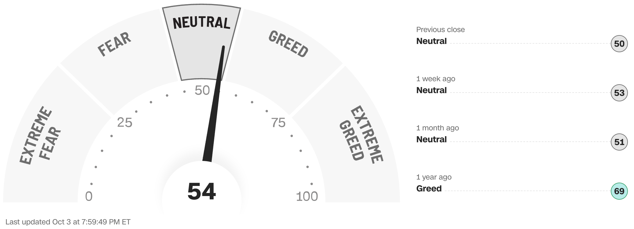 The Fear & Greed Index from CNN Business can be used as an attempt to gauge whether or not stocks are fairly priced and to determine the mood of the market. It is a compilation of seven of the most important indicators that measure different aspects of stock market behavior. They are: market momentum, stock price strength, stock price breadth, put and call option ratio, junk bond demand, market volatility and safe haven demand.