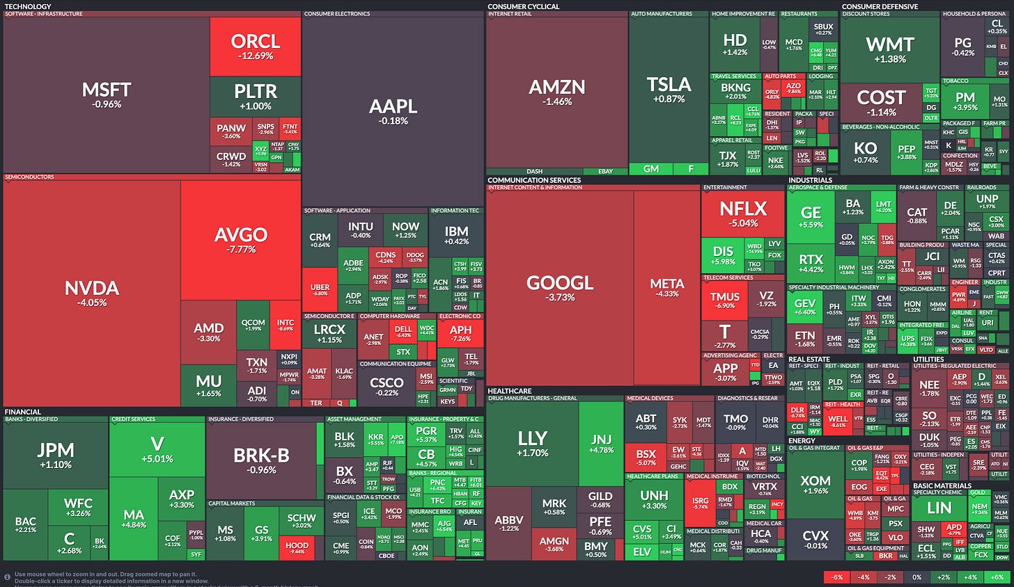 But Friday turned into a rout for Big Tech and especially highly-valued AI stocks as we saw clear signs of a profit-taking rotation away from this year’s big winners. Oracle and Broadcom continued to get brutalized and the pain spread to the likes of AI heavyweights such as Nvidia, CoreWeave and AMD. Inevitably this led to a hefty index plunge, especially the NASDAQ which closed out a rather dismal week getting particularly pounded.
