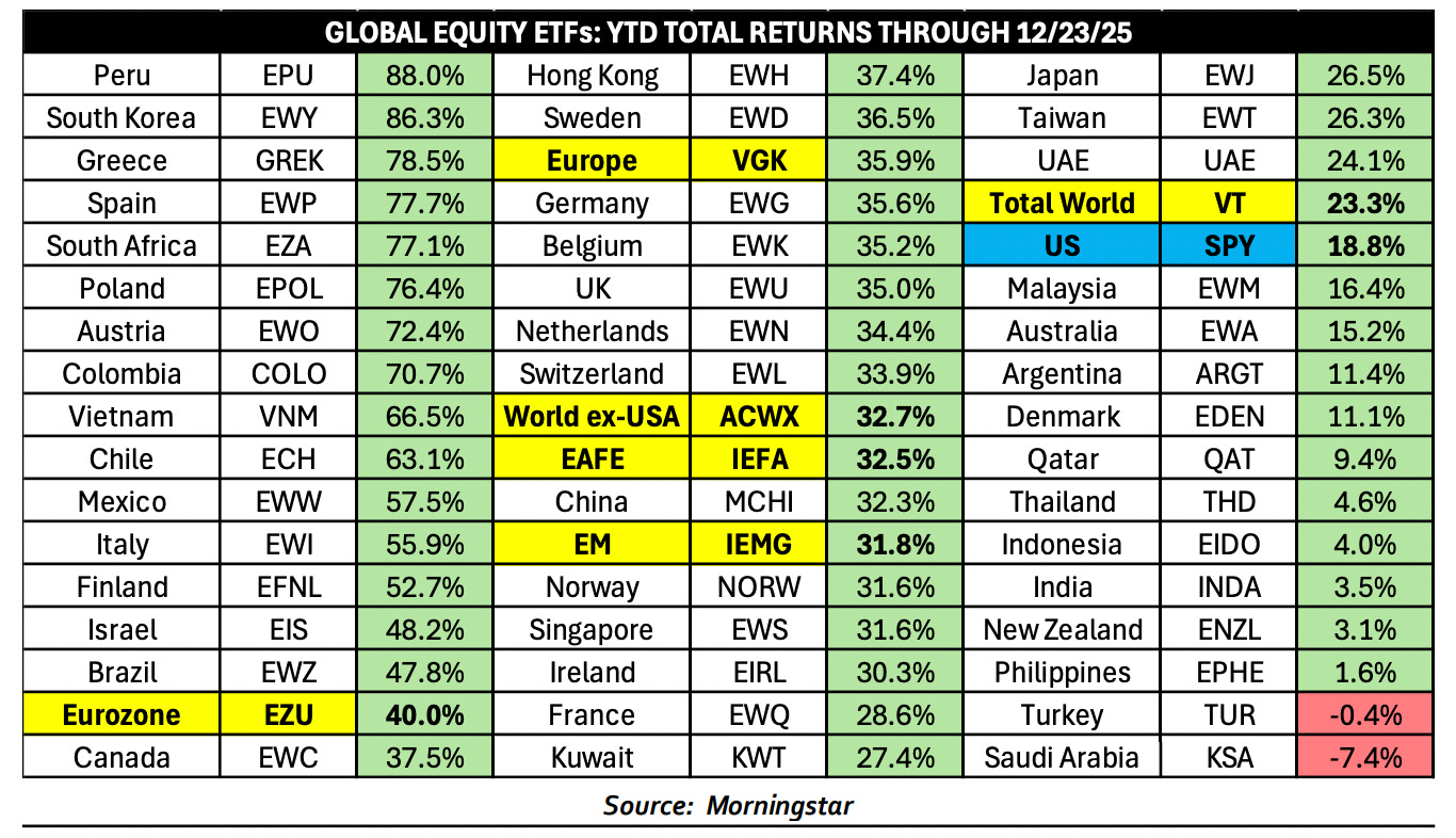 Peru was the world’s best-performing stock market in dollar terms through late December 2025 (+88%) and the worst was Saudi Arabia (-7%).